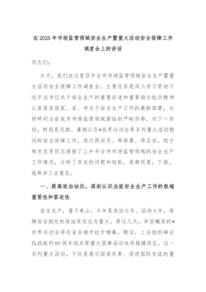 【七哥公文】2025年:在2025年市场监管领域安全生产暨重大活动安全保障工作调度会上的讲话+更多免费公文+VX:QiGeGongWen2024