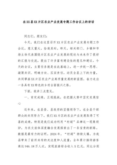 / 【七哥公文】2025年:在XX县XX片区农业产业发展专题工作会议上的讲话+更多免费公文+VX:QiGeGongWen2024