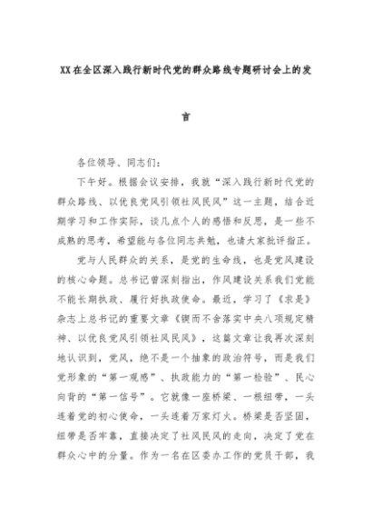 【七哥公文】2025年:XX在全区深入践行新时代党的群众路线专题研讨会上的发言+更多免费公文+VX:QiGeGongWen2024
