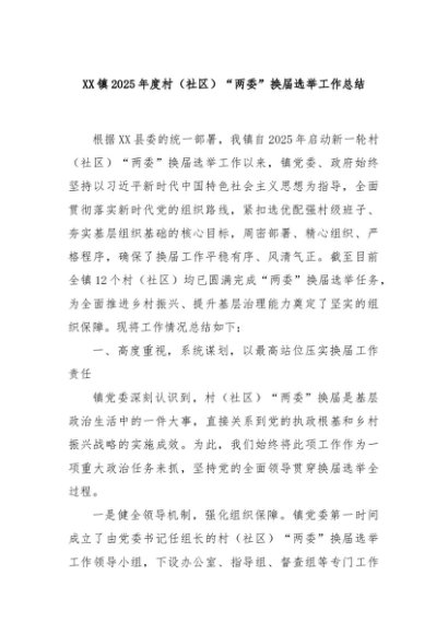 【七哥公文】2025年:XX镇2025年度村(社区)“两委”换届选举工作总结+更多免费公文+VX:QiGeGongWen2024