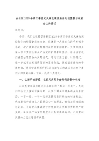 【七哥公文】2025年:在社区2025年第三季度党风廉政建设集体约谈暨警示教育会上的讲话+更多免费公文+VX:QiGeGongWen2024