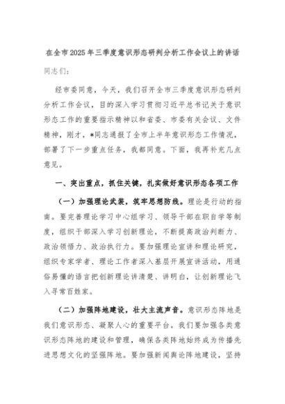 【七哥公文】2025年:在全市2025年三季度意识形态研判分析工作会议上的讲话+更多免费公文+VX:QiGeGongWen2024
