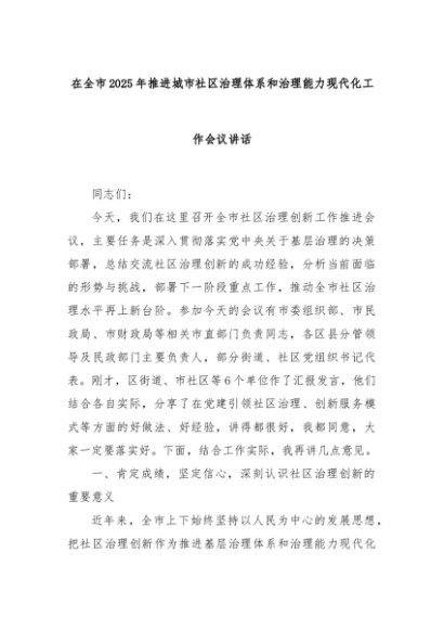 【七哥公文】2025年:在全市2025年推进城市社区治理体系和治理能力现代化工作会议讲话+更多免费公文+VX:QiGeGongWen2024