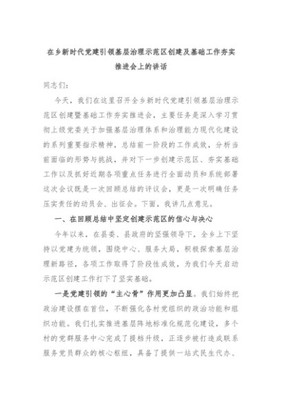 【七哥公文】2025年:在乡新时代党建引领基层治理示范区创建及基础工作夯实推进会上的讲话+更多免费公文+VX:QiGeGongWen2024