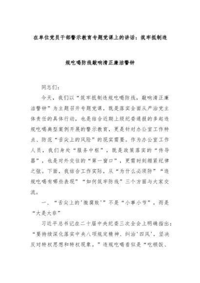【七哥公文】2025年:在单位党员干部警示教育专题党课上的讲话:筑牢抵制违规吃喝防线敲响清正廉洁警钟+更多免费公文+VX:QiGeGongWen2024