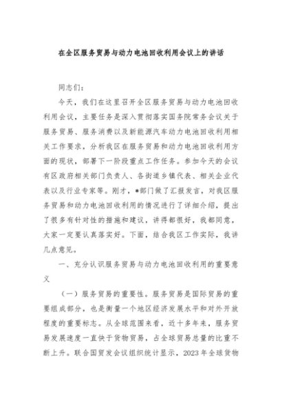 / 【七哥公文】2025年:在全区服务贸易与动力电池回收利用会议上的讲话+更多免费公文+VX:QiGeGongWen2024
