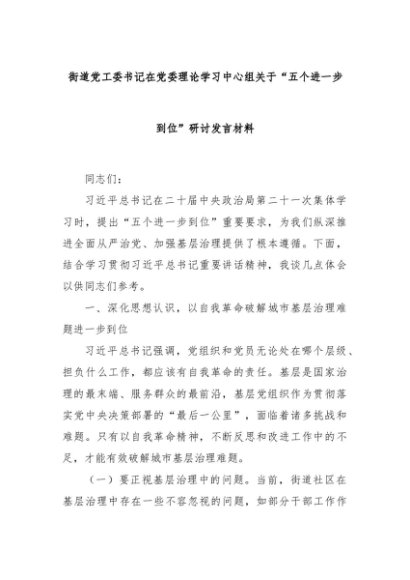 【七哥公文】2025年:街道党工委书记在党委理论学习中心组关于“五个进一步到位”研讨发言材料+更多免费公文+VX:QiGeGongWen2024