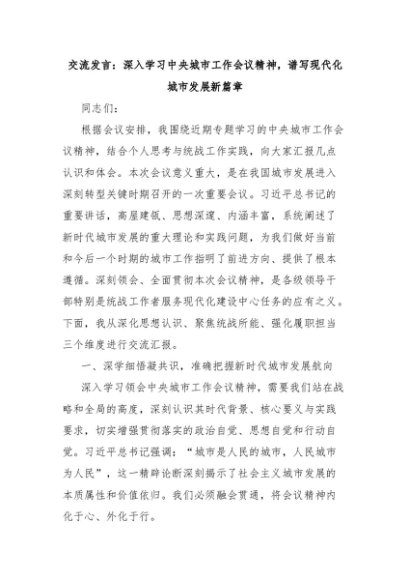 【七哥公文】2025年:交流发言:深入学习中央城市工作会议精神,谱写现代化城市发展新篇章+更多免费公文+VX:QiGeGongWen2024