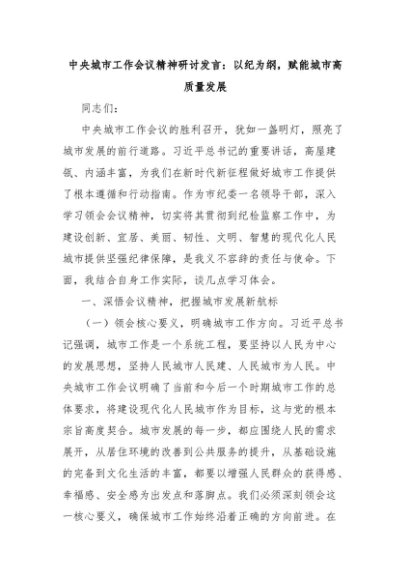 【七哥公文】2025年:中央城市工作会议精神研讨发言:以纪为纲,赋能城市高质量发展+更多免费公文+VX:QiGeGongWen2024