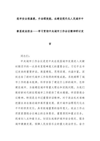 【七哥公文】2025年:筑牢安全根基提,升治理效能,在建设现代化人民城市中彰显政法担当——学习贯彻中央城市工作会议精神研讨发言+更多免费公文+VX:QiGeGongWen2024
