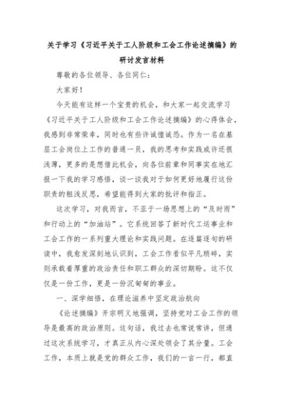 【七哥公文】2025年:关于学习《习近平关于工人阶级和工会工作论述摘编》的研讨发言材料+更多免费公文+VX:QiGeGongWen2024