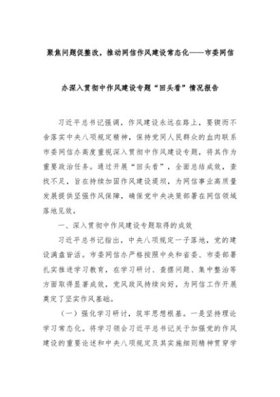【七哥公文】2025年:聚焦问题促整改,推动网信作风建设常态化——市委网信办深入贯彻中作风建设专题“回头看”情况报告+更多免费公文+VX:QiGeGongWen2024
