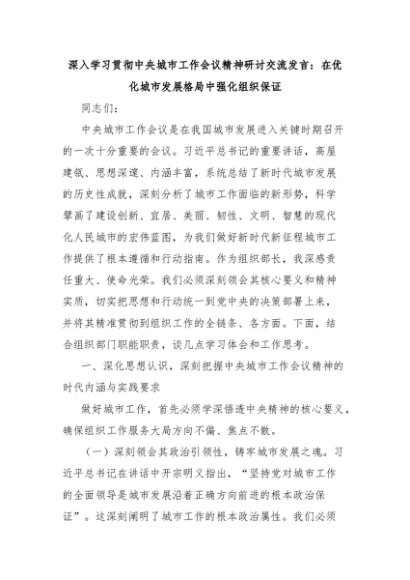 【七哥公文】2025年:深入学习贯彻中央城市工作会议精神研讨交流发言:在优化城市发展格局中强化组织保证+更多免费公文+VX:QiGeGongWen2024