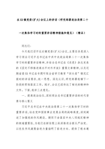 【七哥公文】2025年:在XX镇党委(扩大)会议上的讲话(研究部署政治局第二十一次集体学习时的重要讲话精神措施和意见)(精品)+更多免费公文+VX:QiGeGongWen2024