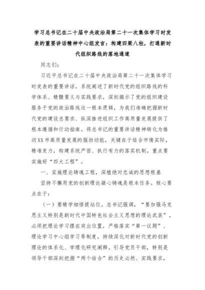 【七哥公文】2025年:学习总书记在二十届中央政治局第二十一次集体学习时发表的重要讲话精神中心组发言:构建四梁八柱,打通新时代组织路线的落地通道+更多免费公文+VX:QiGeGongWen2024