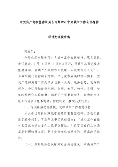 【七哥公文】2025年:市文化广电和旅游局局长专题学习中央城市工作会议精神研讨交流发言稿+更多免费公文+VX:QiGeGongWen2024
