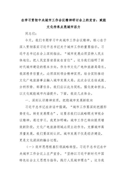 【七哥公文】2025年:在学习贯彻中央城市工作会议精神研讨会上的发言:赋能文化传承点亮城市活力+更多免费公文+VX:QiGeGongWen2024