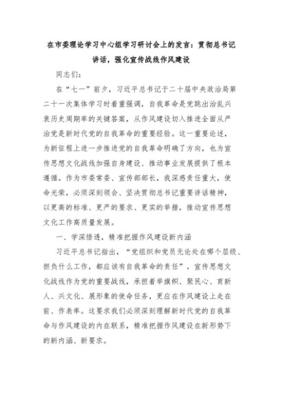 【七哥公文】2025年:在市委理论学习中心组学习研讨会上的发言:贯彻总书记讲话,强化宣传战线作风建设+更多免费公文+VX:QiGeGongWen2024