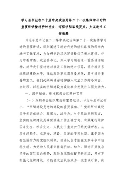 【七哥公文】2025年:学习总书记在二十届中央政治局第二十一次集体学习时的重要讲话精神研讨发言:深悟组织路线要义,夯实政法工作根基+更多免费公文+VX:QiGeGongWen2024