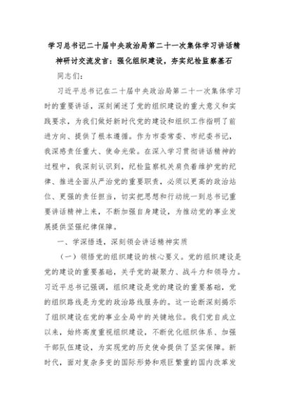 【七哥公文】2025年:学习总书记二十届中央政治局第二十一次集体学习讲话精神研讨交流发言:强化组织建设,夯实纪检监察基石+更多免费公文+VX:QiGeGongWen2024