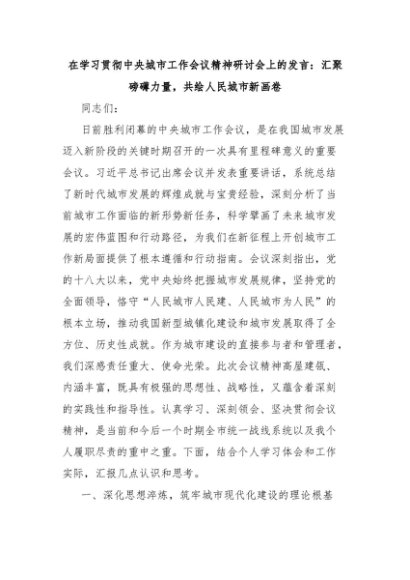 【七哥公文】2025年:在学习贯彻中央城市工作会议精神研讨会上的发言:汇聚磅礴力量,共绘人民城市新画卷+更多免费公文+VX:QiGeGongWen2024