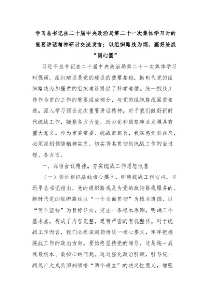 【七哥公文】2025年:学习总书记在二十届中央政治局第二十一次集体学习时的重要讲话精神研讨交流发言:以组织路线为纲,画好统战“同心圆”+更多免费公文+VX:QiGeGongWen2024
