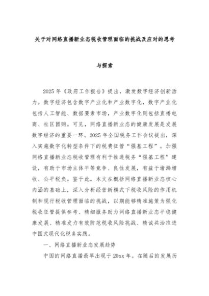 【七哥公文】2025年:关于对网络直播新业态税收管理面临的挑战及应对的思考与探索+更多免费公文+VX:QiGeGongWen2024