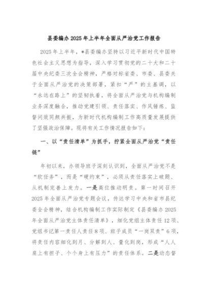 / 【七哥公文】2025年:县委编办2025年上半年全面从严治党工作报告+更多免费公文+VX:QiGeGongWen2024