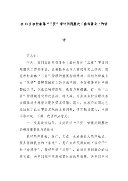 【七哥公文】2025年:在XX乡农村集体“三资”审计问题整改工作部署会上的讲话+更多免费公文+VX:QiGeGongWen2024