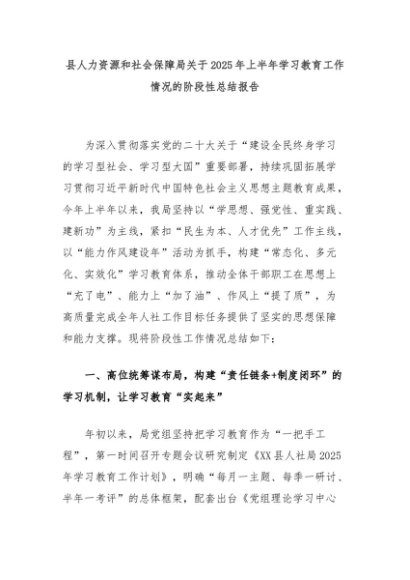 【七哥公文】2025年:县人力资源和社会保障局关于2025年上半年学习教育工作情况的阶段性总结报告+更多免费公文+VX:QiGeGongWen2024