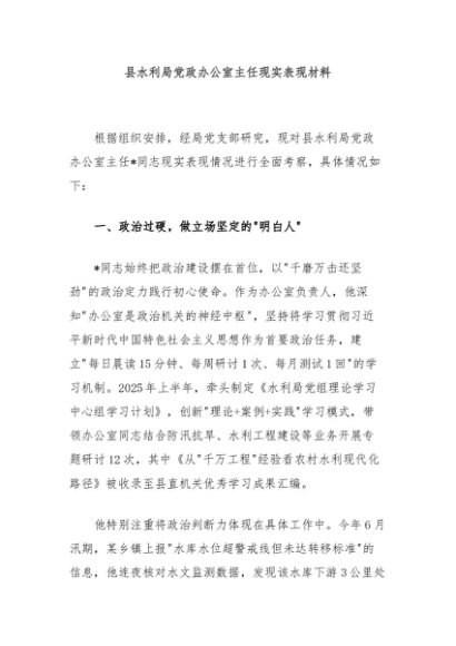 / 【七哥公文】2025年:县水利局党政办公室主任现实表现材料+更多免费公文+VX:QiGeGongWen2024