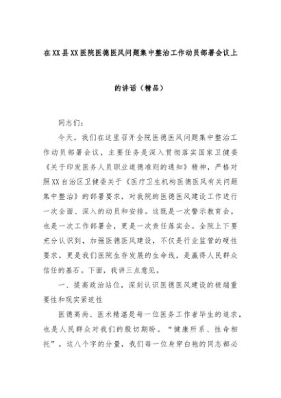 【七哥公文】2025年:在XX县XX医院医德医风问题集中整治工作动员部署会议上的讲话(精品)+更多免费公文+VX:QiGeGongWen2024