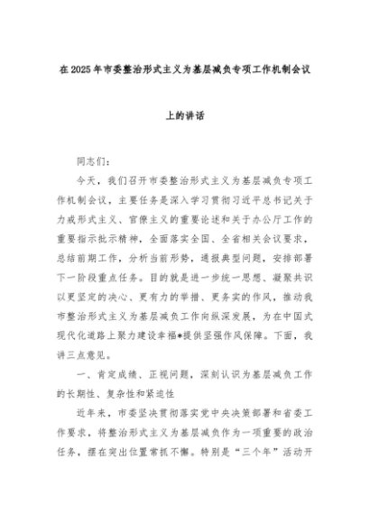 【七哥公文】2025年:在2025年市委整治形式主义为基层减负专项工作机制会议上的讲话+更多免费公文+VX:QiGeGongWen2024