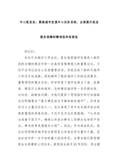 【七哥公文】2025年:中心组发言:聚焦城市发展中心任务目标,全面提升政法服务保障的精准性和实效性+更多免费公文+VX:QiGeGongWen2024
