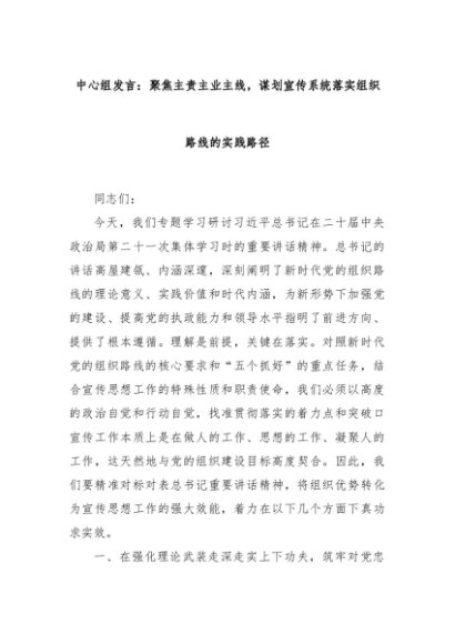 【七哥公文】2025年:中心组发言:聚焦主责主业主线,谋划宣传系统落实组织路线的实践路径+更多免费公文+VX:QiGeGongWen2024