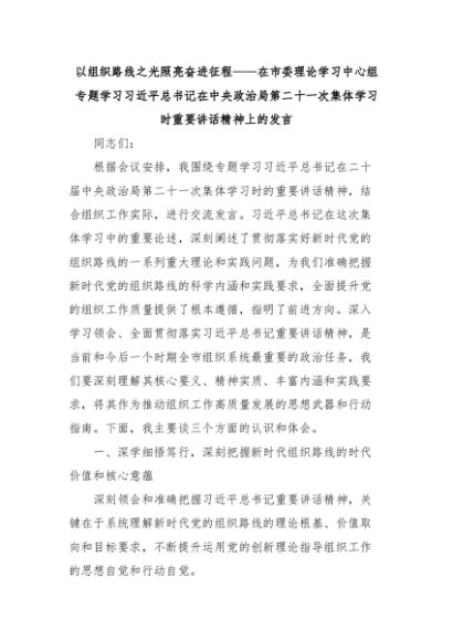 【七哥公文】2025年:以组织路线之光照亮奋进征程——在市委理论学习中心组专题学习习近平总书记在中央政治局第二十一次集体学习时重要讲话精神上的发言+更多免费公文+VX:QiGeGongWen2024