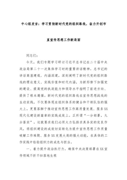 【七哥公文】2025年:中心组发言:学习贯彻新时代党的组织路线,奋力开创市直宣传思想工作新局面+更多免费公文+VX:QiGeGongWen2024