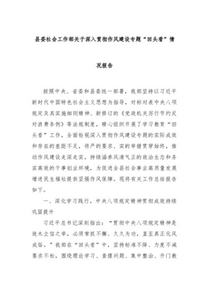 【七哥公文】2025年:县委社会工作部关于深入贯彻作风建设专题“回头看”情况报告+更多免费公文+VX:QiGeGongWen2024
