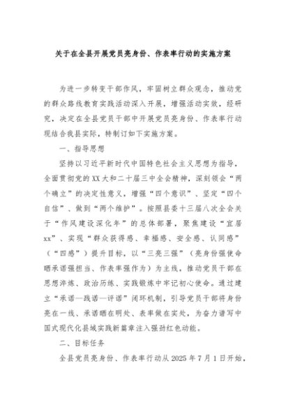 / 【七哥公文】2025年:关于在全县开展党员亮身份、作表率行动的实施方案+更多免费公文+VX:QiGeGongWen2024
