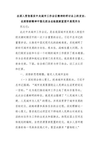 【七哥公文】2025年:在深入贯彻落实中央城市工作会议精神的研讨会上的发言:在深悟新精神中强化担当在绘就新蓝图中展现作为+更多免费公文+VX:QiGeGongWen2024