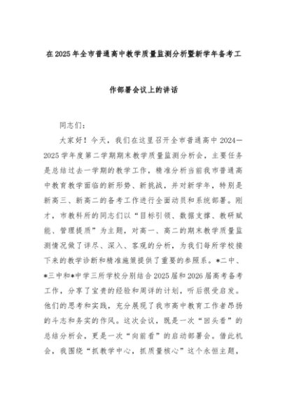 【七哥公文】2025年:在2025年全市普通高中教学质量监测分析暨新学年备考工作部署会议上的讲话+更多免费公文+VX:QiGeGongWen2024