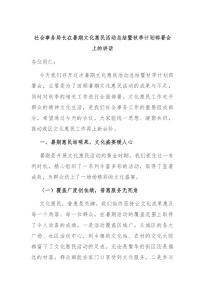【七哥公文】2025年:社会事务局长在暑期文化惠民活动总结暨秋季计划部署会上的讲话+更多免费公文+VX:QiGeGongWen2024