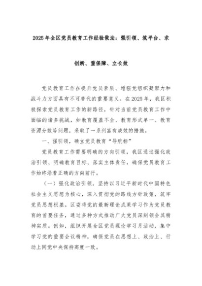 【七哥公文】2025年:2025年全区党员教育工作经验做法:强引领、筑平台、求创新、重保障、立长效+更多免费公文+VX:QiGeGongWen2024