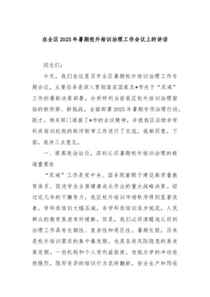 / 【七哥公文】2025年:在全区2025年暑期校外培训治理工作会议上的讲话+更多免费公文+VX:QiGeGongWen2024