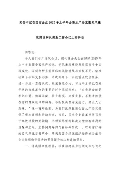 【七哥公文】2025年:党委书记在国有企业2025年上半年全面从严治党暨党风廉政建设和反腐败工作会议上的讲话+更多免费公文+VX:QiGeGongWen2024