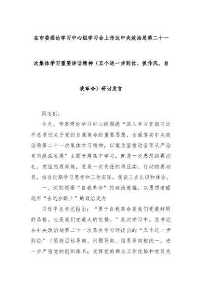 【七哥公文】2025年:在市委理论学习中心组学习会上传达中央政治局第二十一次集体学习重要讲话精神(五个进一步到位、抓作风、自我革命)研讨发言+更多免费公文+VX:QiGeGongWen2024