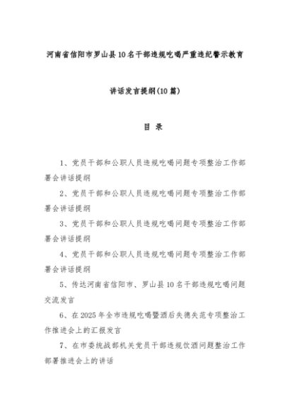 【七哥公文】2025年:(10篇)河南省信阳市罗山县10名干部违规吃喝严重违纪警示教育讲话发言提纲+更多免费公文+VX:QiGeGongWen2024