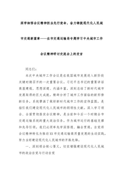 【七哥公文】2025年:深学细悟会议精神担当先行使命,奋力铸就现代化人民城市交通新篇章——在市交通运输局专题学习中央城市工作会议精神研讨交流会上的发言+更多免费公文+VX:QiGeGongWen2024