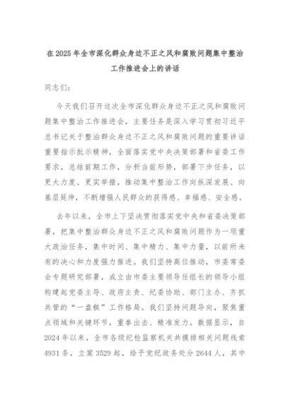 【七哥公文】2025年:在2025年全市深化群众身边不正之风和腐败问题集中整治工作推进会上的讲话+更多免费公文+VX:QiGeGongWen2024