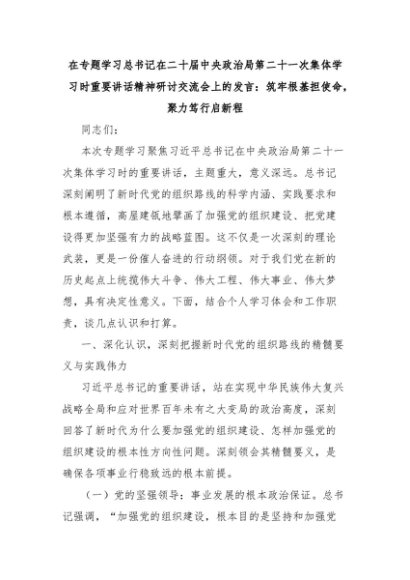 【七哥公文】2025年:在专题学习总书记在二十届中央政治局第二十一次集体学习时重要讲话精神研讨交流会上的发言:筑牢根基担使命,聚力笃行启新程+更多免费公文+VX:QiGeGongWen2024